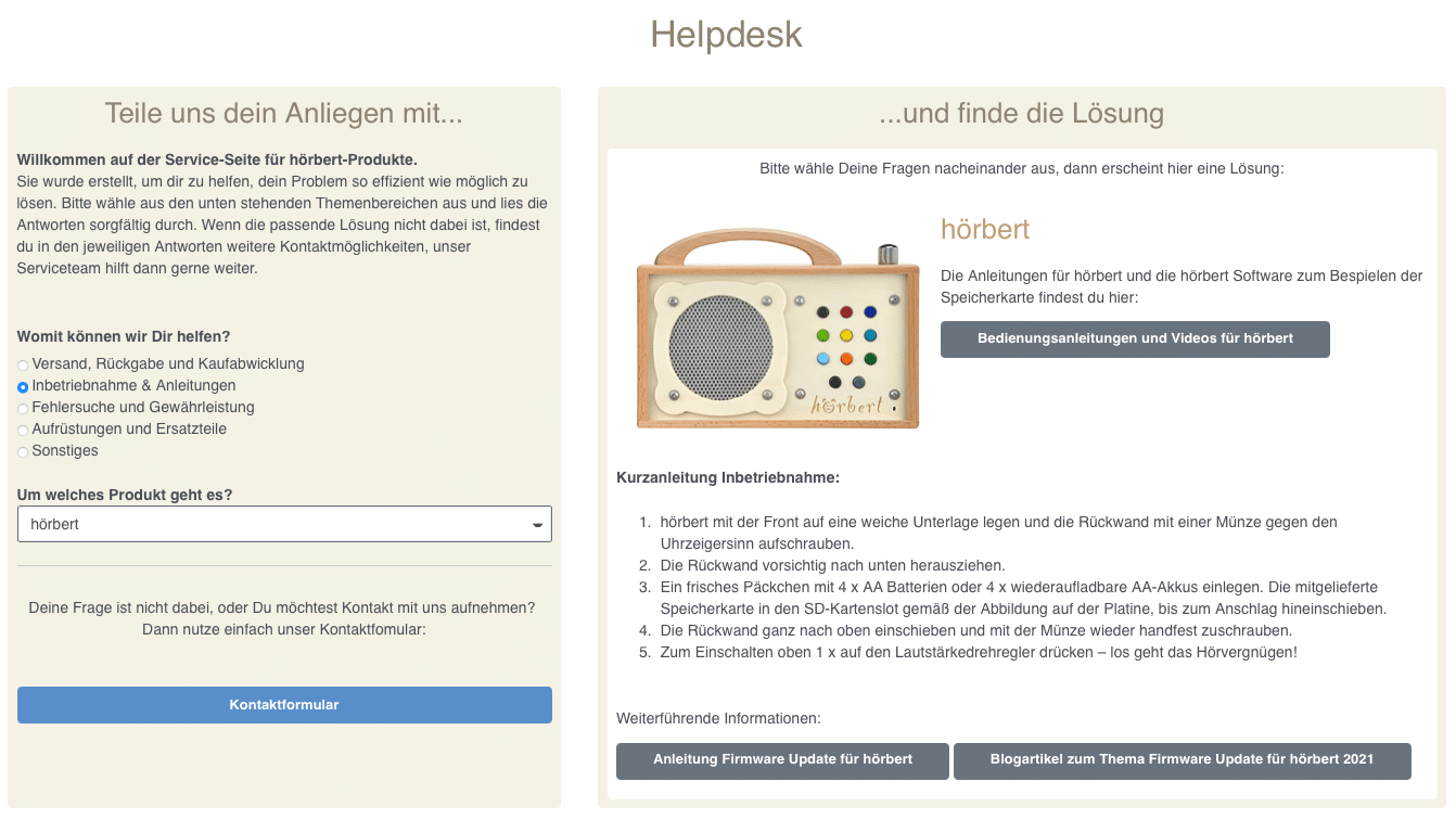 Man kann sich auf der Helpdesk Seite links – ordentlich nach Themen und Produkten sortiert – durch einen Fragen- und Antwortkatalog der häufigsten Themen klicken.