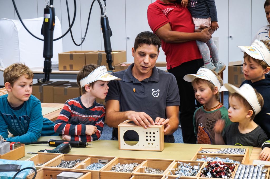 Von der gut einstündigen Tour durch die Werkstatt waren die Eltern mindestens genauso angetan, wie ihre Kinder. „Schließlich sieht man nicht jeden Tag, wie aus einem nackten Gehäuse ein funktionstüchtiges, technisches Gerät entsteht“, so ein begeisterter Vater. Waren die Eltern vor allem von der vielen Handarbeit beeindruckt, die in dem Gerät steckt, hatten es den Kindern die bunten Knöpfe angetan. Einige der jungen Gäste sind selbst Hörbert-Besitzer und wissen, dass diese Knöpfe individuell mit Musik oder Geschichten belegt werden können: „Ich habe einen gelben Technoknopf“, berichtete etwa ein Junge. Während die fünfjährige Josephine die Frage stellte: „Papa, kann mir der Weihnachtsmann einen Hörbert bringen?“