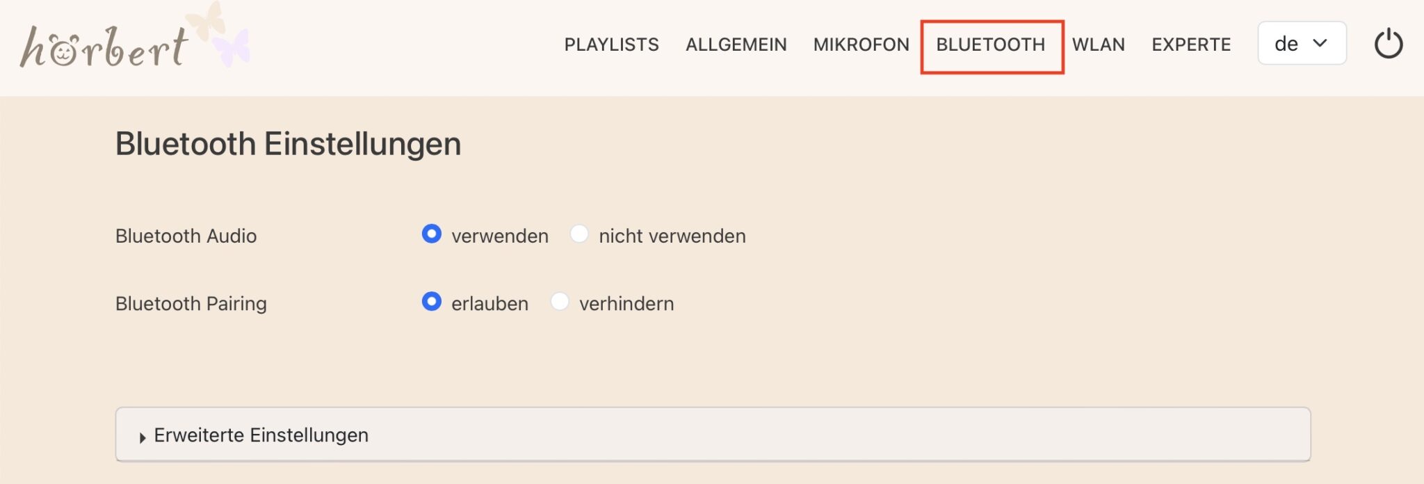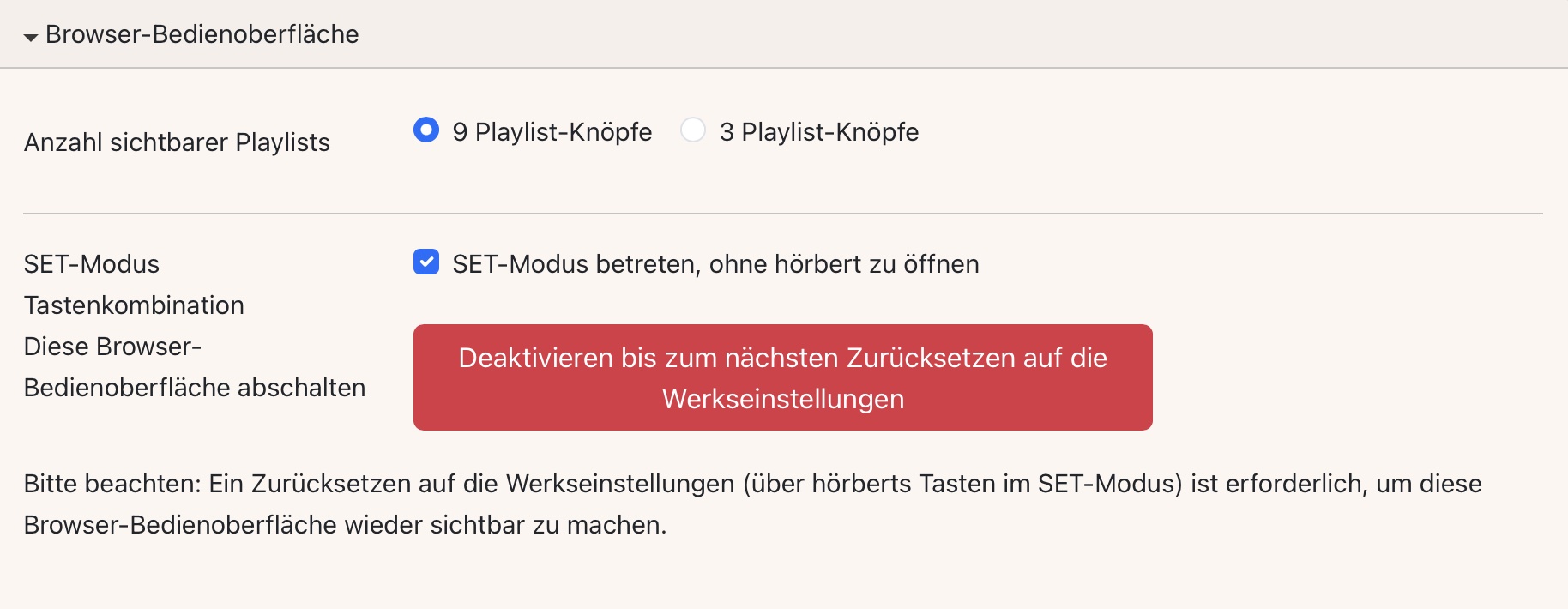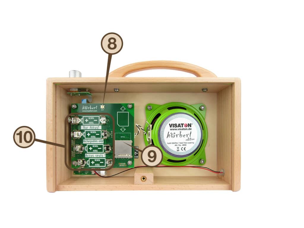 Zusätzlich besitzt hörbert viele erweiterte Funktionen, die über eine Weboberfläche, den Browser Set Mode (9.1), aktiviert werden können. Er lässt sich unter anderem als Bluetooth-Lautsprecher (9.6.4), Podcast-Player (9.4) oder Webradio-Player (9.3.7) nutzen. Dank der Aufnahmefunktionen (8) für Sprache, Bluetooth- und Internetradio-Streams, entstehen keine Folgekosten für neue Hörinhalte. Mit der Einschlaffunktion (9.2.1) begleitet hörbert sanft in den Schlaf. hörbert wird mit einer vorbespielten Speicherkarte ausgeliefert, sodass der Hörspaß sofort beginnen kann. Die Speicherkarte kann mit eigenen Inhalten (5.6) jederzeit ergänzt werden.