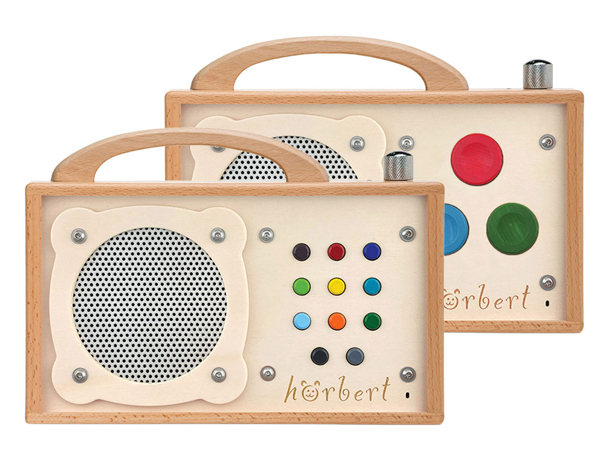 Über die bunten Playlist-Tasten auf der Vorderseite lassen sich die Audioinhalte intuitiv steuern – ganz ohne Display oder Lesekenntnisse, nur per Tastendruck. Daher eignet sich hörbert sowohl für Kleinkinder ab etwa zwei Jahren als auch für Menschen, die mit komplexer Technik Schwierigkeiten haben.